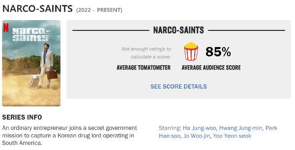 넷플릭스 수리남의 로튼 토마토 점수는 85%, IMDb 점수는 7.4이다. 로튼토마토의 점수는 90%대였는데 확실히 시간이 지나고 보는사람도 많아지니까 점수가 내려가는건 어쩔 수 없다. 그래도 아직은 믿고 봐도 될 정도의 높은 점수이다.